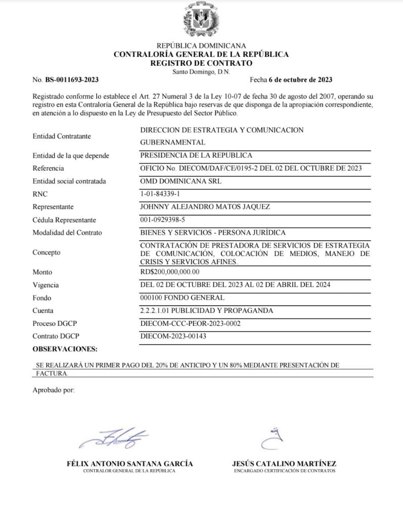 Esta adquisición, fechada el 19 de septiembre de 2023 en el portal, ascendió a RD1,100 millones. En este proceso, se contrataron los servicios de cuatro empresas especializadas en comunicación y publicidad.
