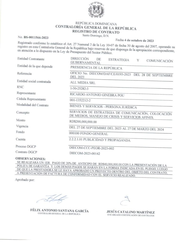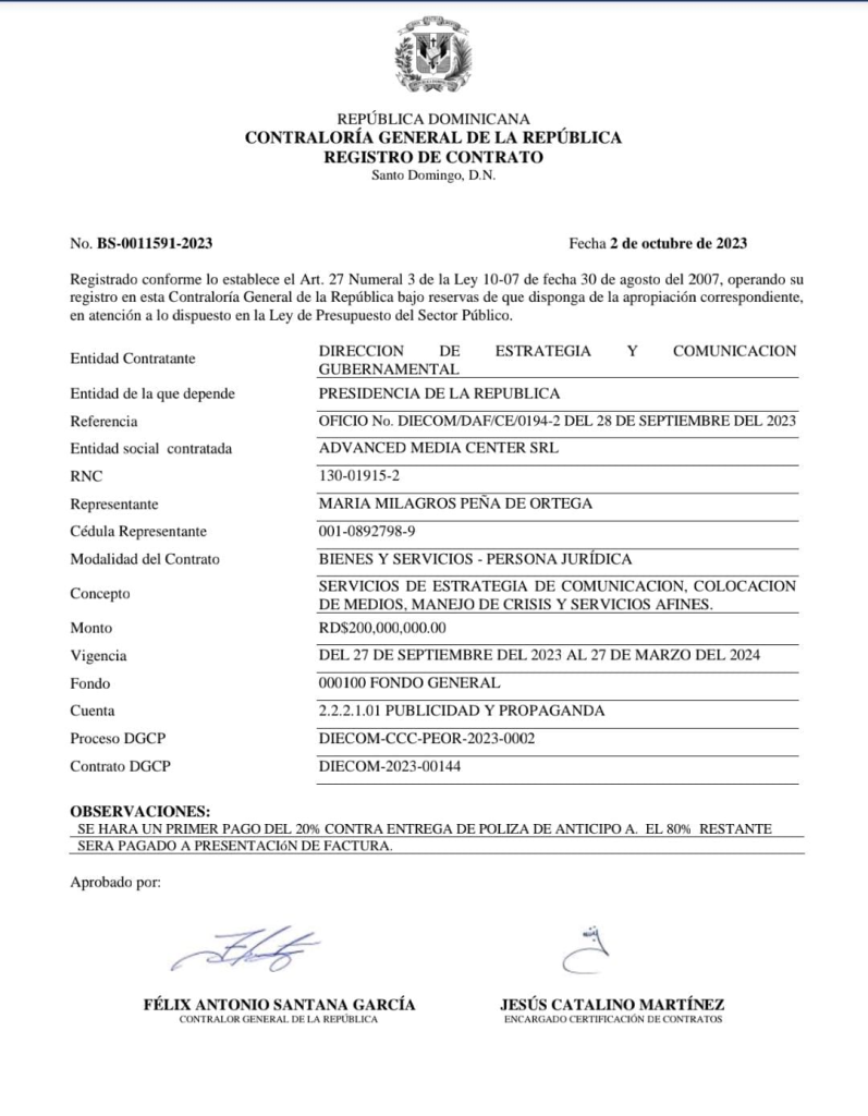 En los últimos cuatro meses del año 2023, la Presidencia de la República, contrató por RD$1,450 millones servicios de publicidad y estrategias de comunicación hasta marzo y febrero de 2024.