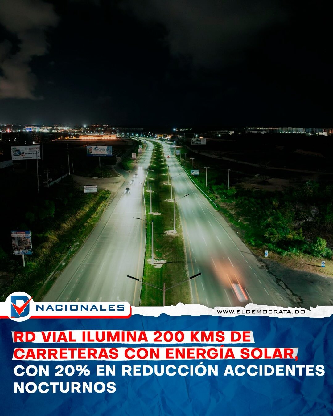 El Fideicomiso RD Vial ejecuta el más ambicioso programa de iluminación vial en la historia de la red de carreteras de la República Dominicana, abarcando, por el momento, 200 kilómetros con más de 10 mil lámparas de tecnología LED, alimentada por energía solar, lo que se traduce en un ahorro millonario por el no uso de electricidad.