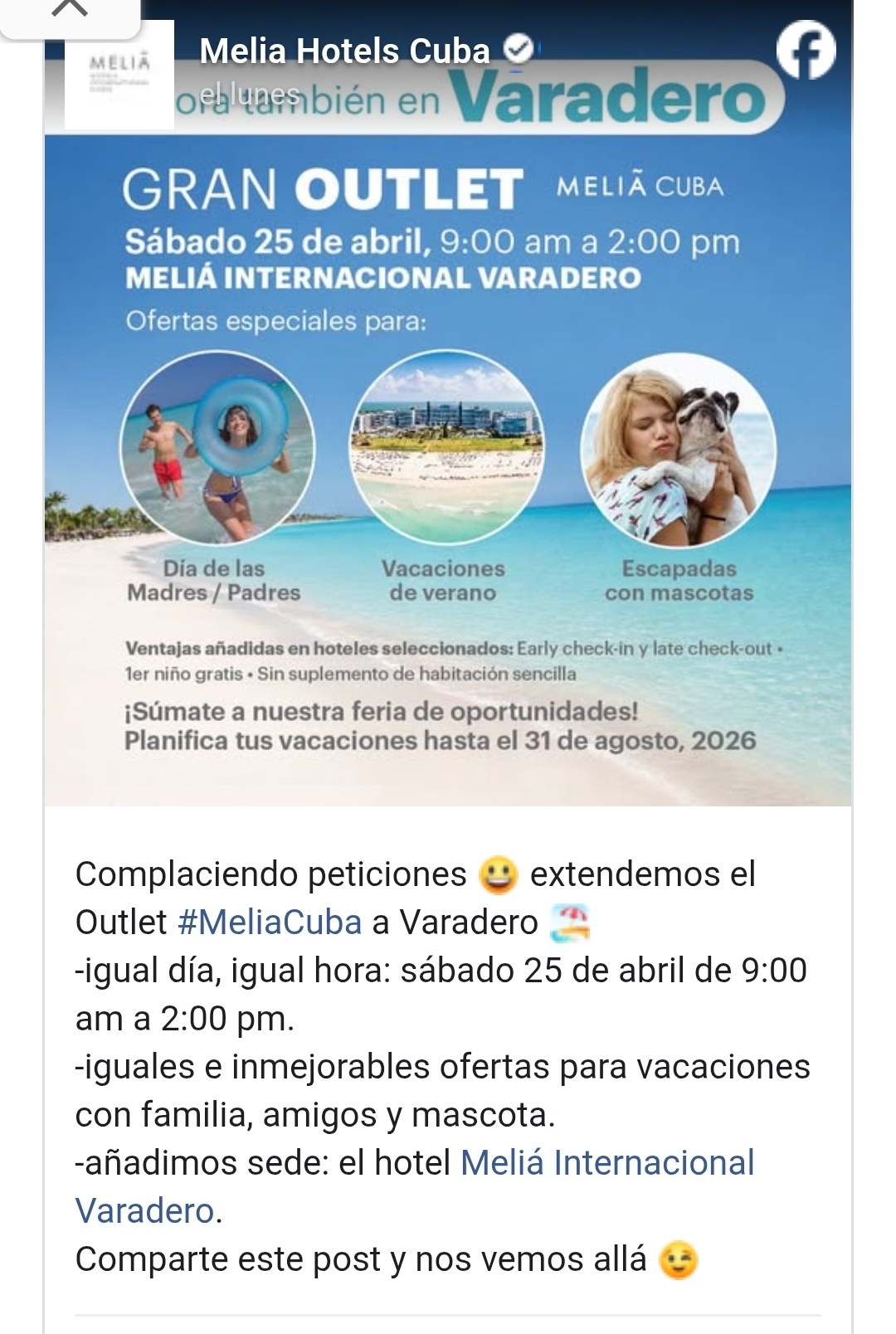 Los hoteles gestionados por Meliá en Cuba anunciaron una jornada de ofertas bajo el nombre de Gran Outlet. La iniciativa busca aumentar las reservas en medio de una notable disminución de visitantes.