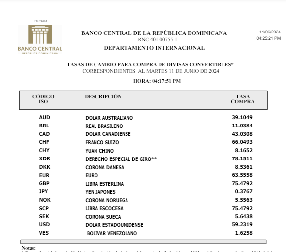 [ad_1] Santo Domingo.- El dólar estadounidense se cambia este miércoles a 59.55 pesos dominicanos para la venta, frente a los 59.59 de la jornada anterior. El Banco Central de la República Dominicana fijó el cambio del peso respecto al dólar estadounidense para hoy de la siguiente manera: Compra: 59.2319 Venta: 59.5575 El euro se cambia para su venta a 65.0482 y para su compra a 63.5558, respecto al peso dominicano, según la tasa fijada por el Banco Central. [ad_2]