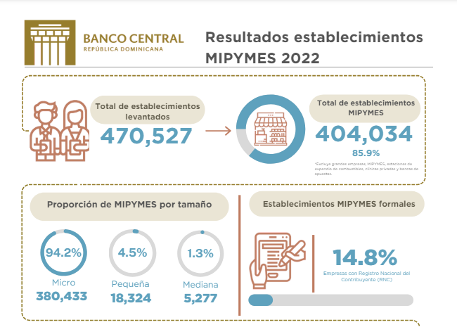 [ad_1] Santo Domingo.- El Banco Central presentó los resultados de la Encuesta Nacional de MiPymes del año 2022 donde se especifica que en total de unos 470,527 establecimientos encuestados el 85% de ellos son MiPymes con la cifra de 404,034. Por el tamaño de la MiPyme, se divide en: 380,433 las micro empresas, unas 18,324 las pequeñas empresas y unas 5,277 las medianas empresas. Con lo que representan un 94.2% para la micro, un 4.5% para la pequeña empresa y 1.3% de la mediana empresa. El 14.8 % de las…