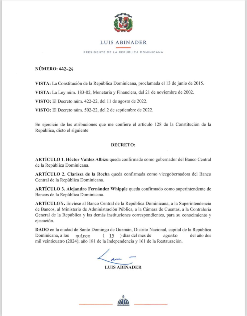 [ad_1] Santo Domingo. – El presidente de la República, Luis Abinader, emitió el decreto 442-24 mediante el cual confirmó a Héctor Valdez Albizu y Clarissa de la Rocha, como Gobernador y Vicegobernadora del Banco Central del país. A través del mismo decreto, Abinader confirmó a Alejandro Fernández W como superintendente de Bancos. Estos funcionarios estuvieron durante el primer cuatrienio del mandatario, que mañana se juramenta por segunda vez como presidente de la República. Un comunicado del Gobierno señala que estas designaciones subrayan el compromiso del Presidente Abinader con la estabilidad…