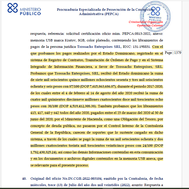 Según indica el expediente de la acusación del Caso Calamar, le empresa Trossachs Enterprises SRL, recibio pagos del Estado dominicano la suma de siete mil seiscientos quince millones ochocientos sesenta y tres mil seiscientos ochenta y seis pesos con 87/100 (DOP 7,615,863,686.87), durante el periodo 2017-2020, de los cuales entre el 4 de febrero al 14 de agosto del año 2020 recibió la suma de cuatro mil quinientos diecinueve millones cuatrocientos doce mil trescientos ocho pesos con 38/100 (DOP 4,519,412,308.38).