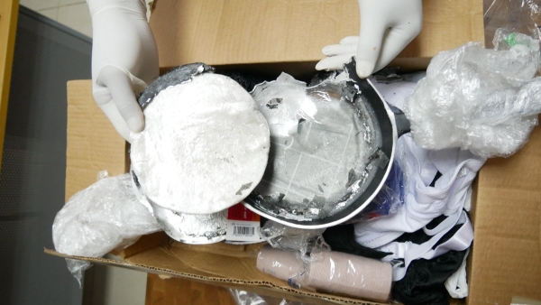 En un operativo de inspección conjunta, agentes de la Dirección Nacional de Control de Drogas (DNCD) y miembros del Ministerio Público, descubrieron en el interior de una caja de cartón, dos sartenes con un doble fondo, relleno de cocaína.