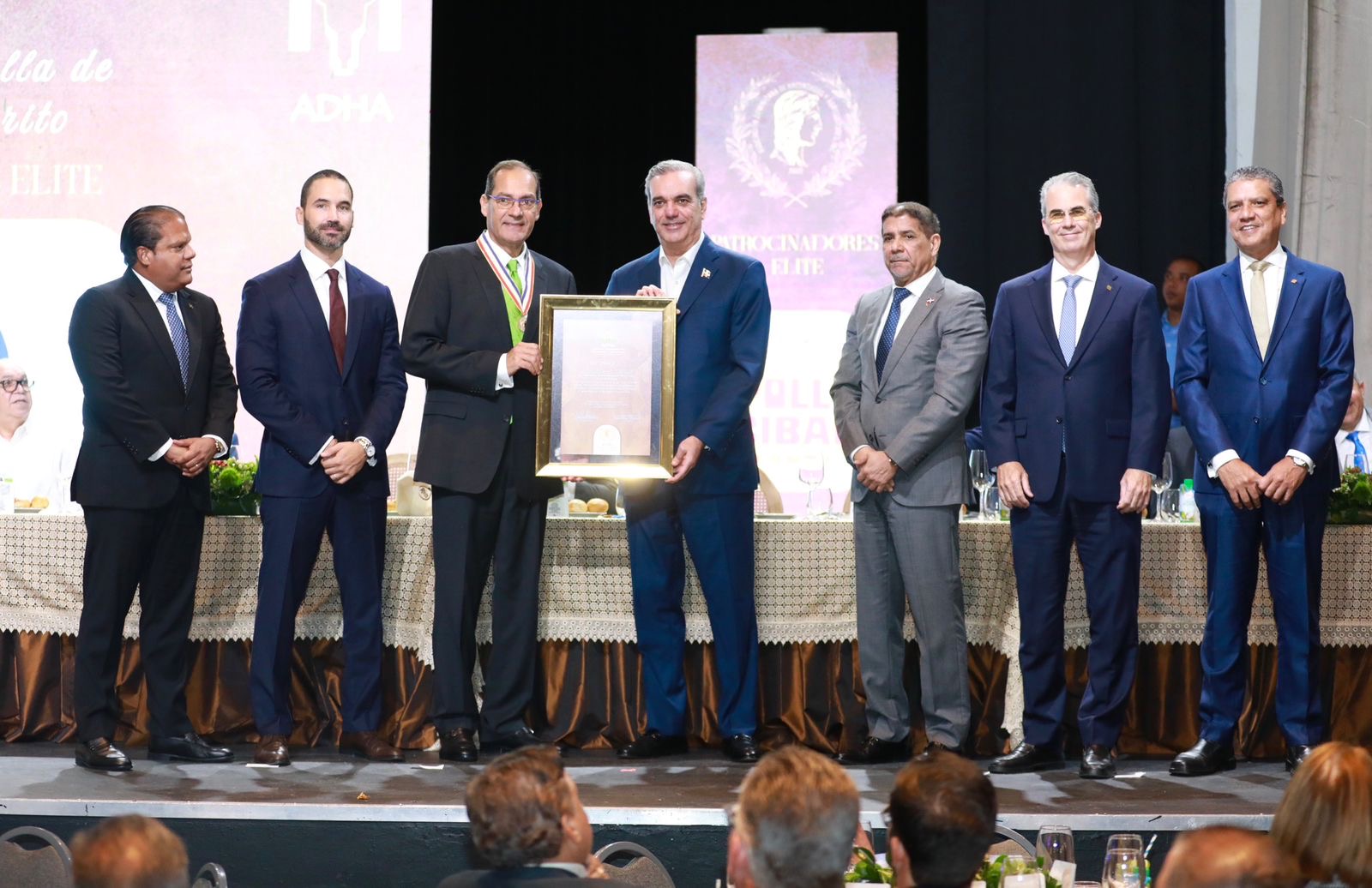 Santo Domingo.- El presidente Luis Abinader fue reconocido este viernes con la Medalla de Honor al Mérito y una placa por la Asociación Dominicana de Hacendados y Agricultores de República Dominicana (ADHA), por su liderazgo y compromiso con el sector agropecuario nacional, con lo cual ha fortalecido la seguridad alimentaria y ha dado apoyo los productores, además de promover durante su gestión las exportaciones y las políticas públicas orientadas a su modernización y sostenibilidad.
