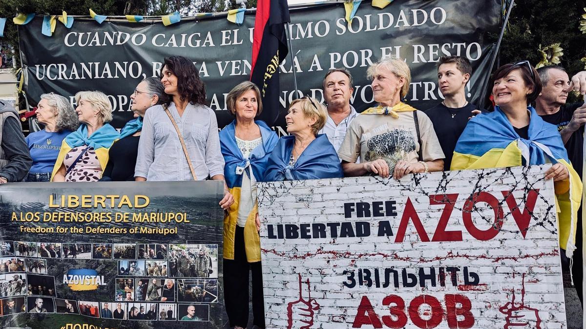 Otro cartel de la concentración, sostenido por mujeres, pedía la libertad de los defensores de la planta Azovstal, último reducto de la resistencia ucraniana en Mariupol, sostenida hasta el 17 de mayo de 2022. Hasta ahora, Rusia ha devuelto cerca de 200 de esos defensores, y siguen cautivos más de 900, según fuentes ucranianas.