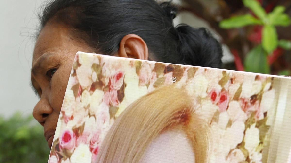 La madre de la víctima, Thongpin Kiatchanasiri, acudió a la vista condenatoria y salió del tribunal con un cartel con la foto de su hija Siriporn.