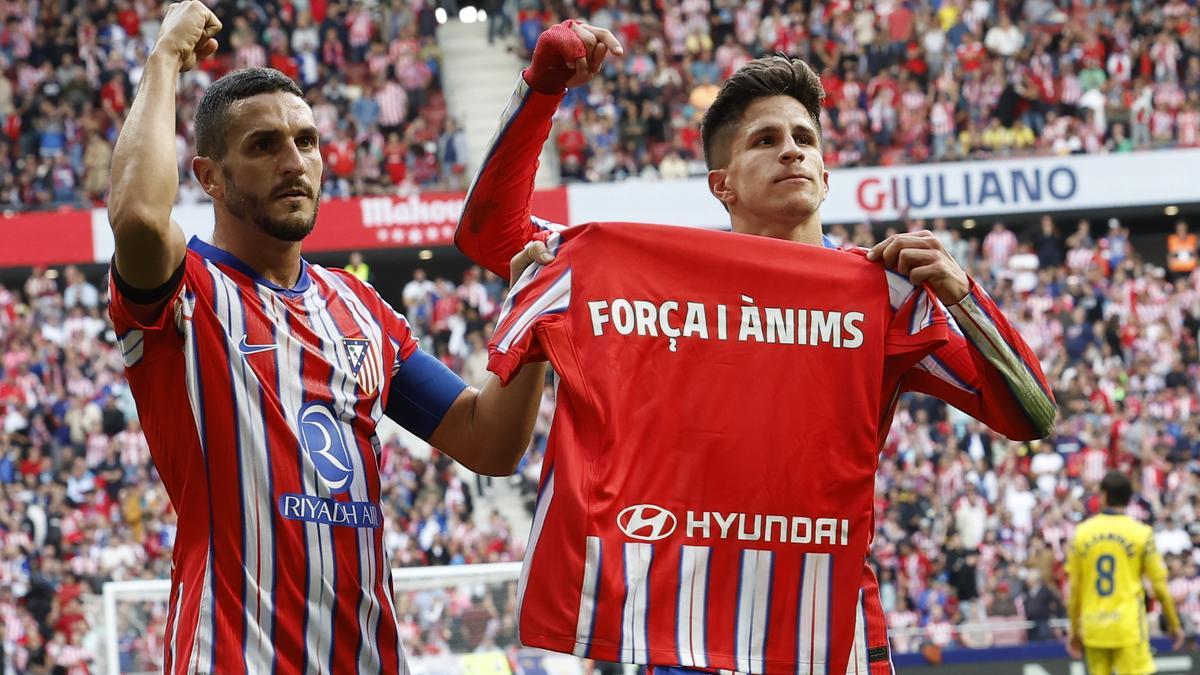 Los detalles continuaron durante el partido, con los jugadores del Atlético sujetando las banderas de las peñas rojiblancas de Paiporta y Utiel, dos de las localidades más golpeadas por el desastre, durante el emocionante minuto de silencio previo. También en la celebración del gol de Giuliano, en la que el joven argentino levantó junto a Koke una camiseta del Atlético en la que se leía «Força i ànims», «Fuerza y ánimos».