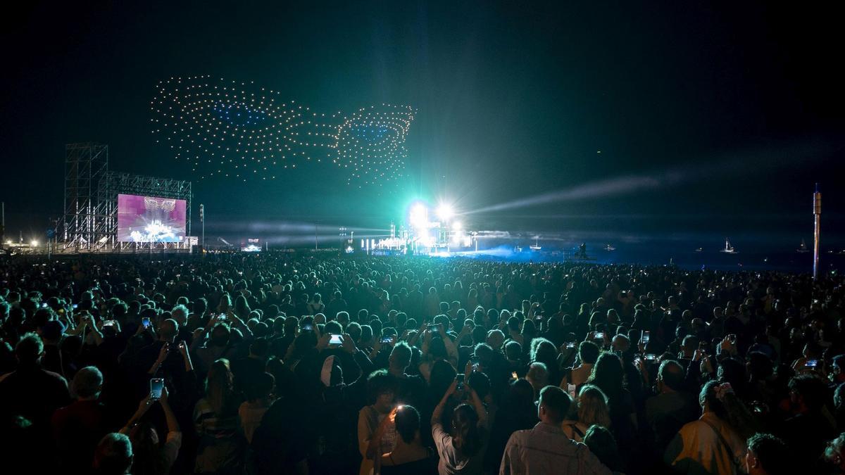Pepita tiene 82 años y su idea era venir aunque fuera sola porque no quería perderse el espectáculo. En el autobús, de camino se ha encontrado a Alex y su familia. Todos iban al mismo sitio así que se han juntado en uno de los cotizados bancos de piedra de la Playa del Bogatellpara disfrutar de esta fiesta. “Mi hija no me podía acompañar, porque vive en Solsona, pero no me lo quería perder porque desde casa veía que estaban montando cosas y he preferido venir a verlo en persona”, dice sonriente. “Soy una moderna”, reconoce Pepita entre risas.