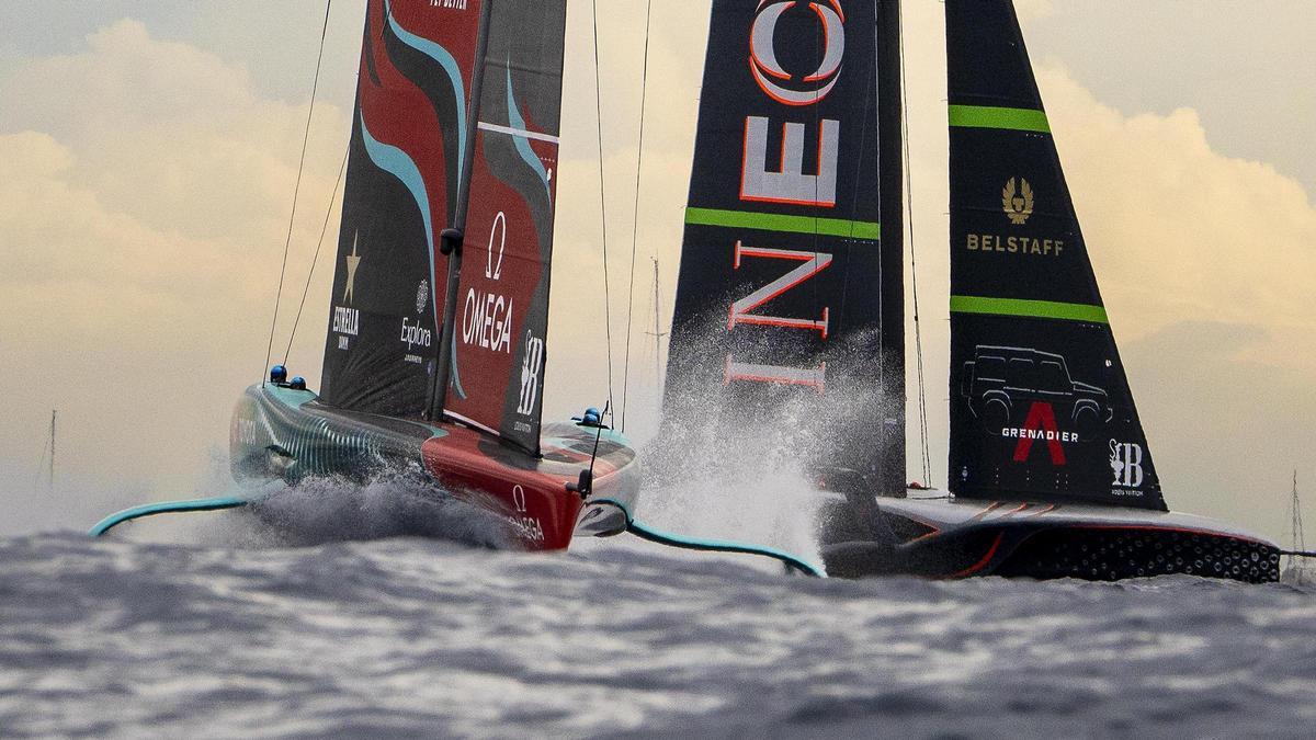 Los AC75 de Ineos Britannia y Emirates Team New Zealand en la séptima regata de la final de la Copa América de vela, este viernes. / Ferran Nadeu