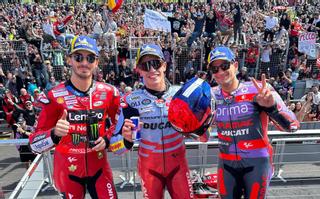 Clasificación GP: 1. Marc Márquez (Ducati), 39 minutos 47.702 segundos; 2. Jorge Martín (Ducati), a 0.997 segundos; 3. ‘Pecco’ Bagnaia (Ducati), a 10.100 segundos; 4. Fabio Di Giannantonio (Ducati), a 12.997 segundos y 5. Enea Bastianini (Ducati), a 13.310 segundos.