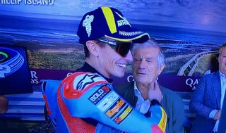 El más campeón de todos, Giacomo Agostini, felicita a Marc Márquez, hoy, en el podio de Australia.yoyj / DORNA SPORTS