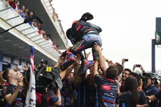 Ai Ogura es manteado por su equipo tras conquistar, ayer, el título mundial de Moto2. / ALEJANDRO CERESUELA