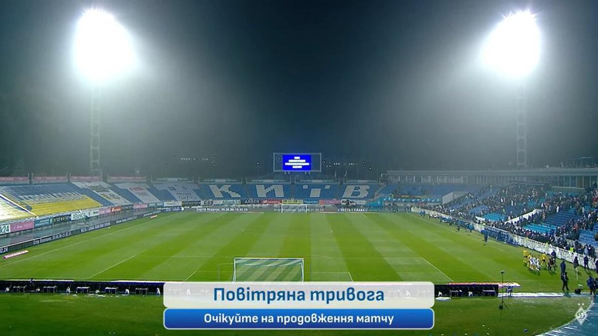 El partido entre el Dinamo Kiev y el Oleksandriya, de la decimosexta jornada de la Liga de Ucrania, fue interrumpido a la media hora de la segunda parte, con ventaja para el equipo local por 3-0, por alerta de ataque aéreo en el estadio Olímpico de Kiev.