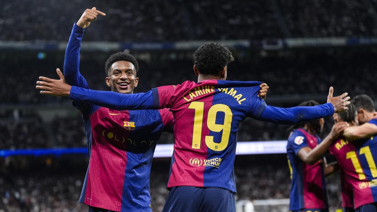 Lamine Yamal celebra su gol en el clásico contra el Madrid junto a Lewandowski. / Afp