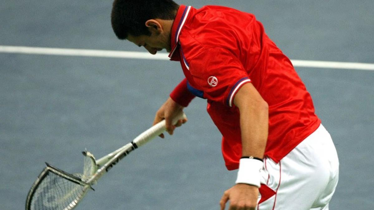Novak Djokovic rompe su raqueta durante una eliminatoria de la Copa Davis contra el tenista francés Gael Monfils, en el Belgrado Arena (Serbia), el 5 de diciembre de 2010 / EFE