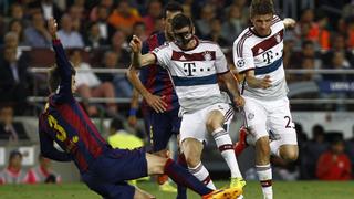 Gerard Piqué intenta interceptar una incursión de Lewandowski y Müller en una visita del Bayern al Camp Nou. / Quique García / Efe